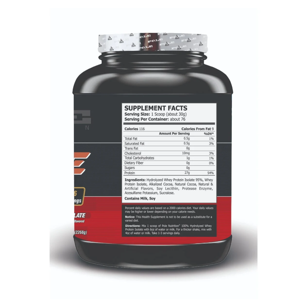 - Pole Nutrition Isolate 100% Hydrolyzed whey provides 27g protein per serving